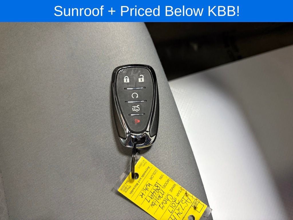 Cole Valley Chevrolet Family Owned and Operated Since 1914, 2017 Chevrolet Malibu LT in Summit White Vehicles Highlights include...., Backup Camera, Sunroof | Moonroof, Clean Vehicle History Report, One Owner Vehicle History Report, Non Smoker, Local Trade, Dark Atmosphere/Medium Ash Gray Cloth, 120-Volt Power Outlet, 17 Aluminum Wheels, 18 Aluminum Wheels, 3-Spoke Leather-Wrapped Steering Wheel, 4-Wheel Disc Brakes, 6 Speakers, 8-Way Power Driver Seat Adjuster, ABS brakes, Air Conditioning, All-Weather Floor Mats, Alloy wheels, AM/FM radio: SiriusXM, Apple CarPlay/Android Auto, Brake assist, Bumpers: body-color, Compass, Convenience & Technology Package, Delay-off headlights, Driver door bin, Driver Information System w/Color Display, Driver vanity mirror, Dual front impact airbags, Dual front side impact airbags, Dual USB Charging-Only Ports, Electronic Stability Control, Emergency communication system, Exterior Parking Camera Rear, Four wheel independent suspension, Front anti-roll bar, Front Bucket Seats, Front Center Armrest w/Storage, Front Passenger 6-Way Manual Seat Adjuster, Front reading lights, Fully automatic headlights, Heated door mirrors, Illuminated entry, Inside Rear-View Auto-Dimming Mirror, Knee airbag, Leather Wrapped Shift Knob, Low tire pressure warning, Occupant sensing airbag, Outside temperature display, Overhead airbag, Overhead console, Panic alarm, Passenger door bin, Passenger vanity mirror, Power door mirrors, Power Driver Lumbar Control Seat Adjuster, Power driver seat, Power steering, Power Tilt Sliding Sunroof, Power windows, Preferred Equipment Group 1LT, Premium Cloth Seat Trim, Radio data system, Radio: Chevrolet MyLink AM/FM Stereo w/7 Screen, Radio: Chevrolet MyLink AM/FM Stereo w/8 Screen, Rear anti-roll bar, Rear reading lights, Rear seat center armrest, Rear side impact airbag, Rear window defroster, Remote keyless entry, Remote Vehicle Starter System, Security system, SiriusXM Satellite Radio, Speed control, Split folding rear seat, Steering wheel mounted audio controls, Tachometer, Telescoping steering wheel, Tilt steering wheel, Traction control, Trip computer, Turn signal indicator mirrors, Universal Home Remote, Variably intermittent wipers, Wheel Locks, Wireless Charging For Devices. Priced below KBB Fair Purchase Price! 27/36 City/Highway MPG Odometer is 24554 miles below market average!
